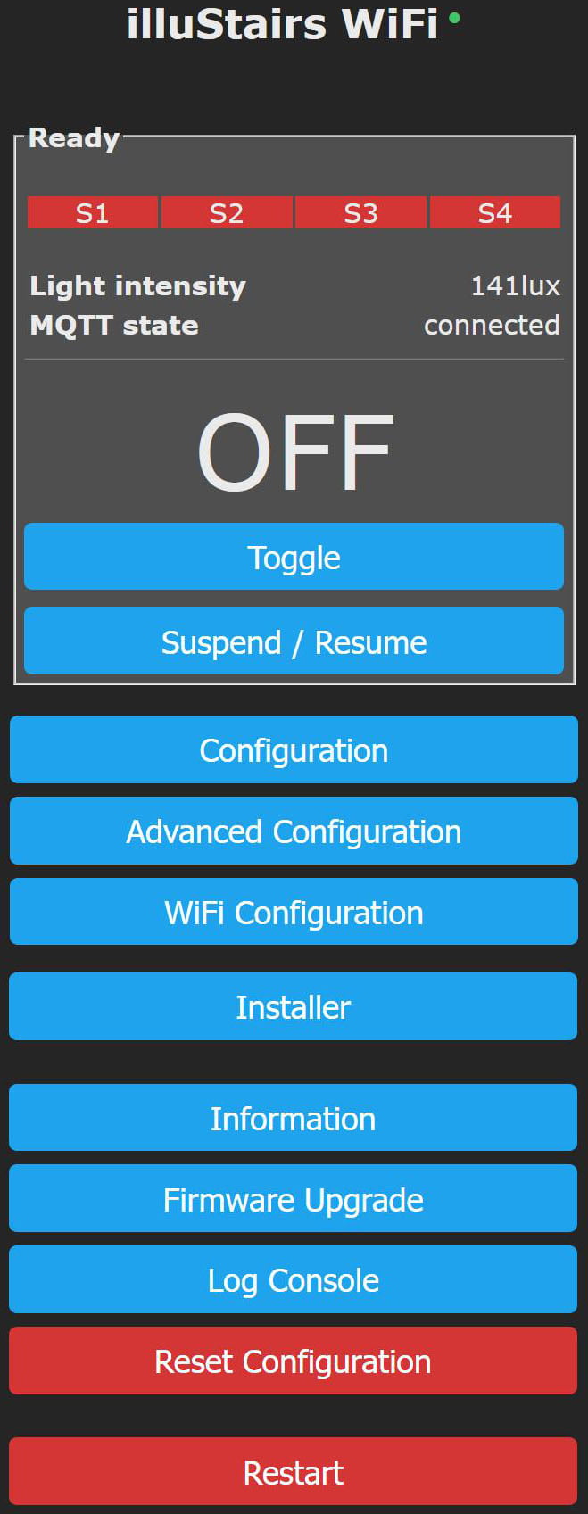 state_topic: "illuStairs/stat/system_state" # Ready, Always on, Suspended by light, Suspended by button long press